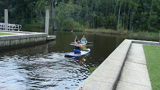 When we got to the dock (it is a boat dock where people go boating) our instructor asked us who we thought would be the best at doing this. I said Bri would be because she is so good at yoga and stuff. So she got the inflatable one. Little did we know that was the hardest one. She lasted about 15 minutes and fell in. Thankfully the instructor let her use his (which is what is shown in the pictures). I tried the inflatable one after we got back to see what it was like - it really is hard. It is very wobbly. I guess the reason that people get inflatable ones is they are cheaper (about $200 cheaper - typically an inflatable one is about $400) and it is easy to take it with you. I was thinking it would be awesome to have one, but you would need a place to store it and they are just plain huge! Not only that but you would need a vehicle that could carry it - they weigh about 40 pounds and are so long. I guess that is why people get inflatable ones - they are portable.